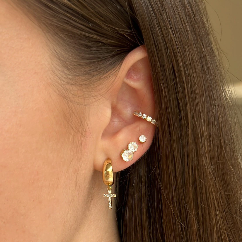 Argolinha de pino com cruz cravejada, este brinco de argola é uma peça clássica que combina elegância e modernidade. Com um design liso, com o pingente em cruz cravejada adiciona um toque de brilho e simbolismo, tornando-o um acessório especial. Uma escolha ideal para quem busca um toque de glamour e significado nos seus acessórios. Perfeito parauso diário ou ocasiões especiais. Com banho em ouro 18 k. Antialérgico, apropriado para peles sensíveis.