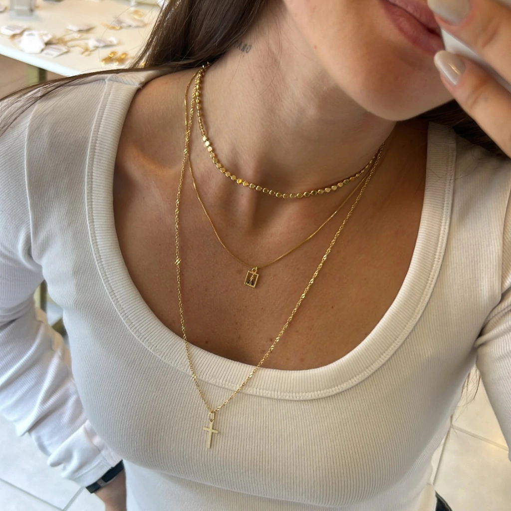 Colar com cruz lisa, medindo 60 cm, delicado, com um design minimalista, apresenta um pingente em forma de cruz lisa, adicionando um toque de charme, simbolismo e fé à peça. Ideal para usar sozinho ou compondo looks com outros colares, criando um efeito moderno e personalizado. É uma peça que simboliza fé e estilo de forma elegante. podendo usar tanto no dia a dia quanto em eventos mais formais. Com banho em ouro 18k. Antialérgico, apropriado para peles sensíveis.
